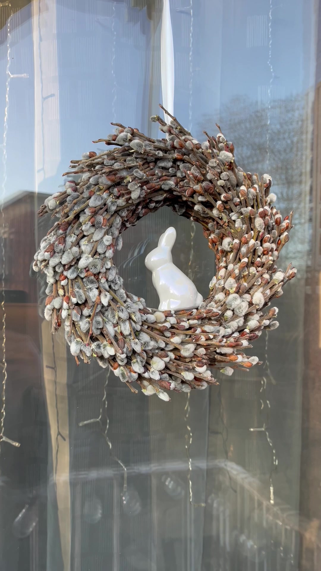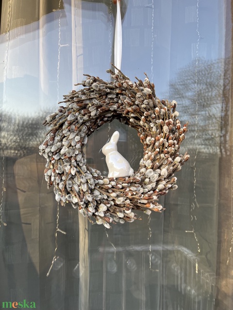Hozd el az otthonodba a tavasz frissességét és a húsvét letisztult eleganciáját ezzel a természetes barkából készült ajtókopogtatóval. A gondosan összeállított, puha tapintású barka ágak harmonikus koszorút alkotnak, melynek középpontjában egy fényes, fehér kerámia nyuszi kapott helyet – visszafogott, mégis különleges díszítőelem.