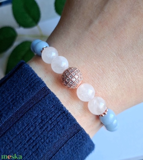 Rózsakvarc és angelit nőies ásvány karkötő rose gold cirkóniás gömbbel