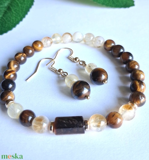 A karkötő középpontjában egy henger alakú tigrisszem díszgyöngy helyezkedik el, amelyet világos citrin szemek és aranyszínű részletek emelnek ki. A hozzá illő, nemesacél akasztós fülbevaló finoman egészíti ki a szettet, egységes és elegáns megjelenést biztosítva.