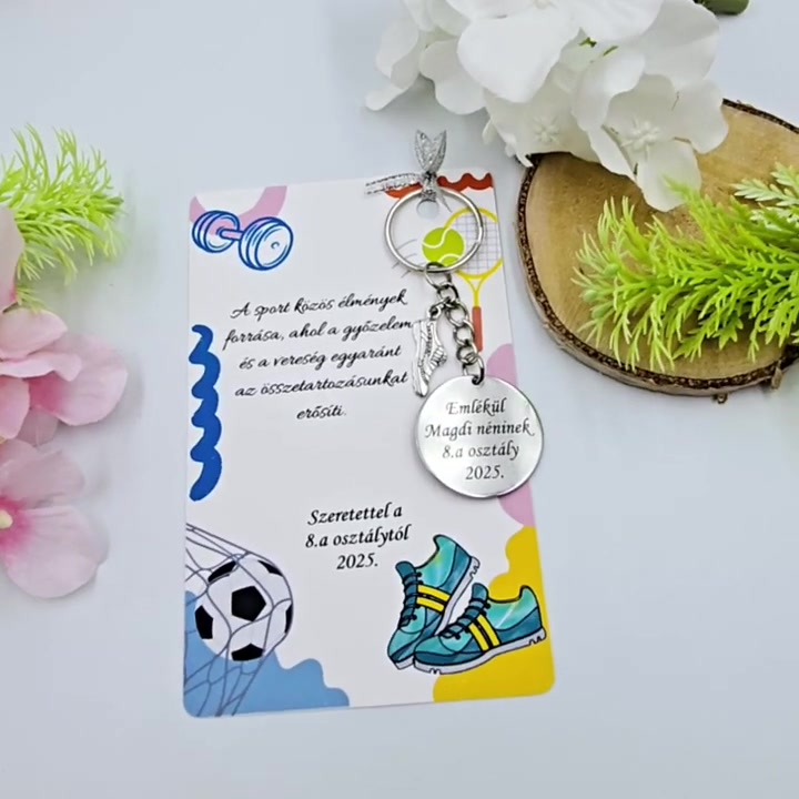 Ajándék testneveléstanároknak ballagásra, pedagógusnapra, tanév végére - Gravírozott ballagási kulcstartó ajándékkártyán