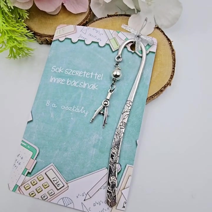Ajándék matematikatanároknak ballagásra, pedagógusnapra, tanév végére - Könyvjelző körző charmmal, ajándékkártyán