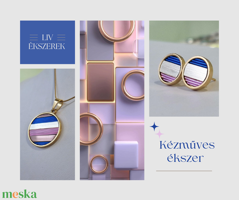 Kék, rózsaszín, arany, kézműves medál, fülbevaló, nyaklánc