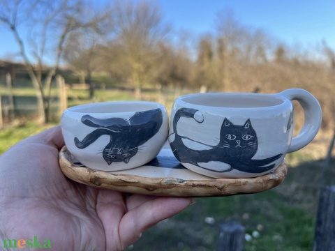 Cicás kerámia szett – nyújtózó macskával és meghitt, játékos pillanatokkal