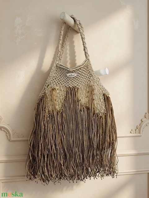 Krém–bézs rojtos makramé táska – bohém elegancia, kivehető belső zsákkal