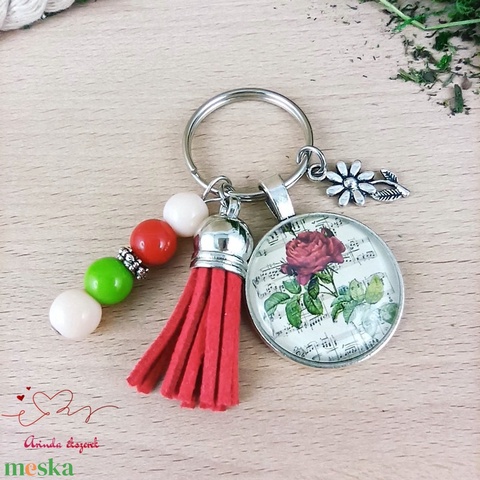 Romantikus rózsás üveglencsés kulcstartó piros bojttal – virágos ajándék nőknek