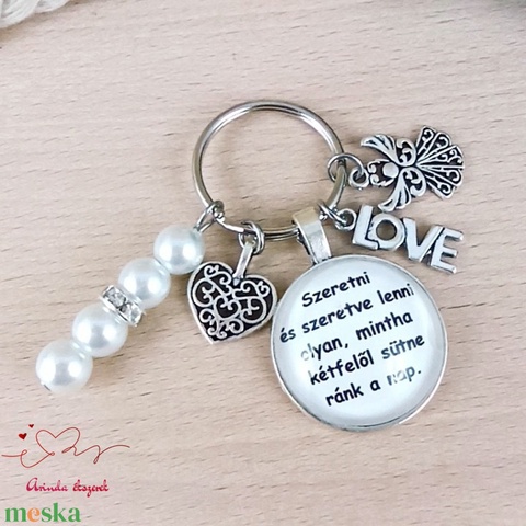 „Szeretni és szeretve lenni” idézetes üveglencsés kulcstartó – romantikus ajándék LOVE medállal