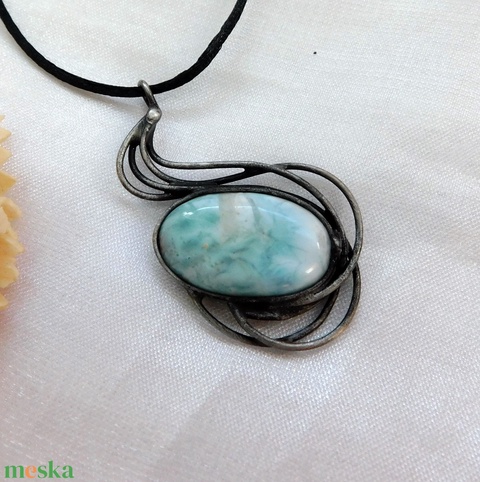 A medál Tiffany technikával készült larimár, réz és ólommentes, ezüsttartalmú ón felhasználásával. A díszítés szintén saját készítésű, nem tartalmaz gyári elemeket. A fémrészt óezüstre antikoltam és lelakkoztam, hogy sokáig szép maradjon.