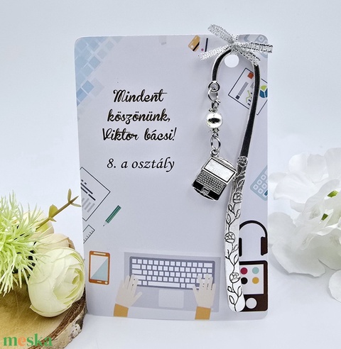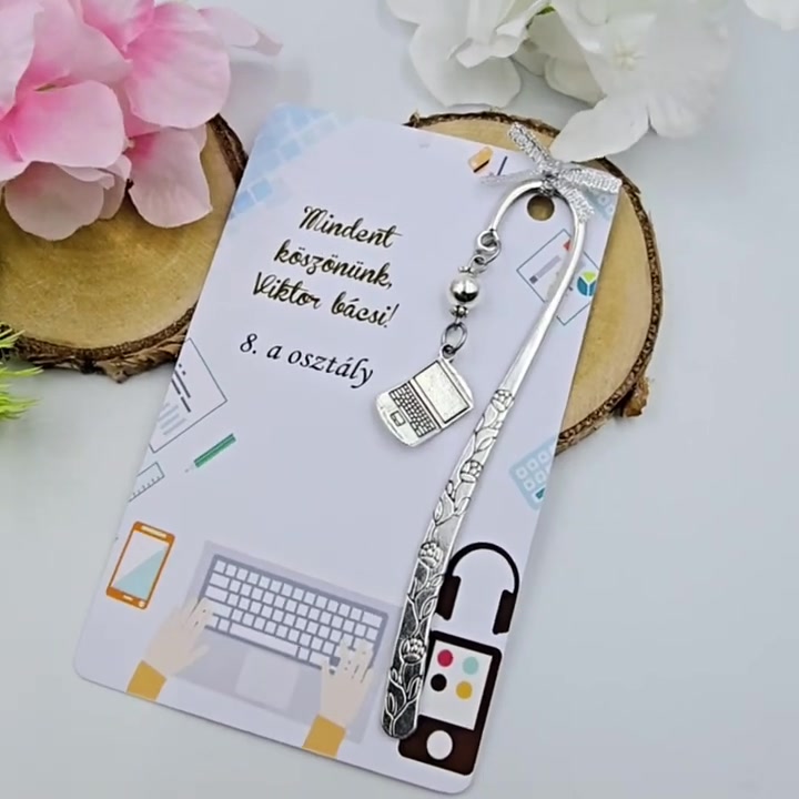 Ajándék informatikatanároknak ballagásra, pedagógusnapra, tanév végére - Könyvjelző laptop charmmal, ajándékkártyán