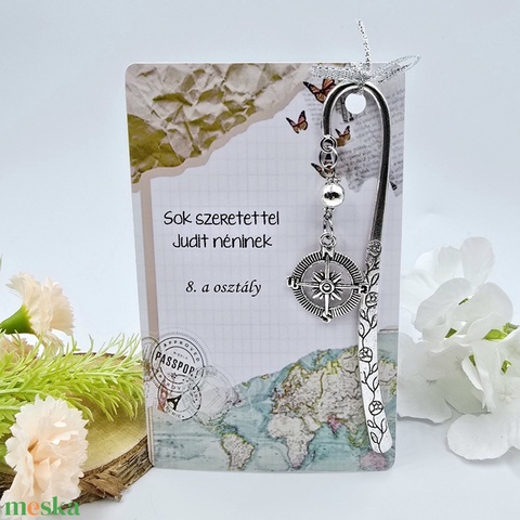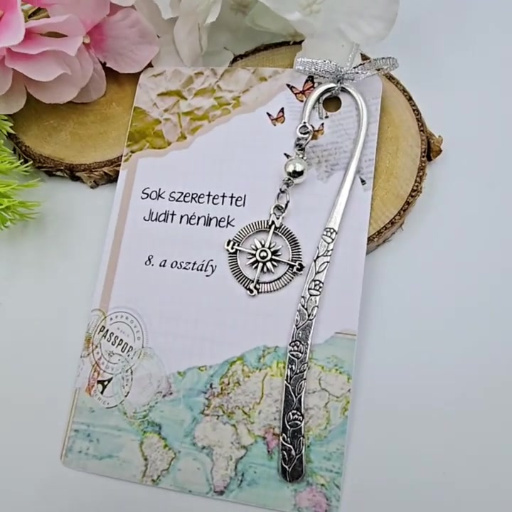 Ajándék földrajztanároknak ballagásra, pedagógusnapra, tanév végére - Könyvjelző iránytű charmmal, ajándékkártyán