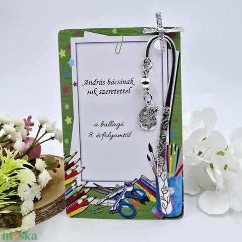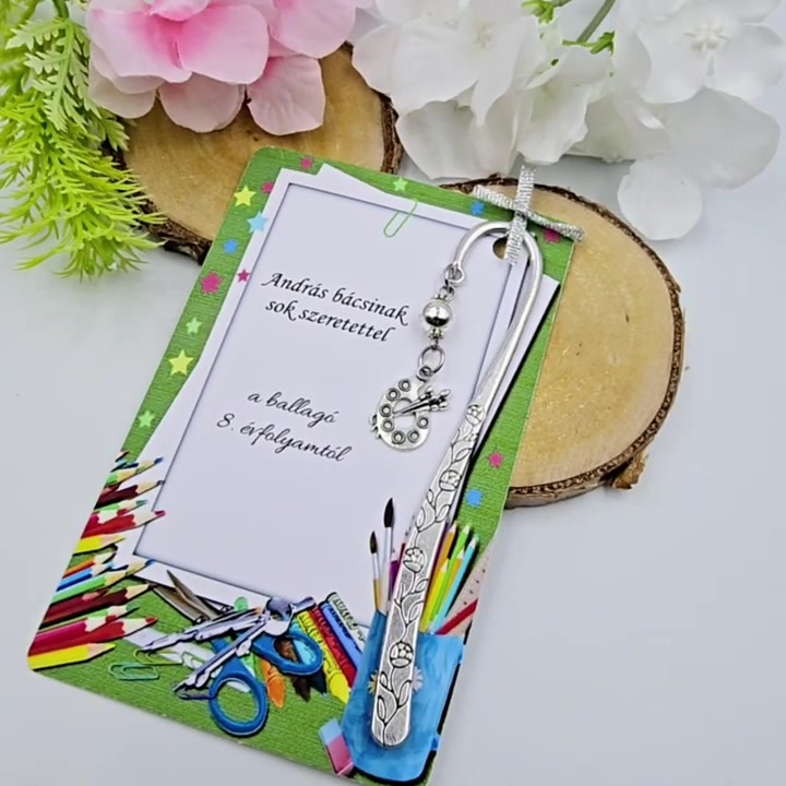 Ajándék rajztanároknak ballagásra, pedagógusnapra, tanév végére - Könyvjelző festőpaletta charmmal, ajándékkártyán