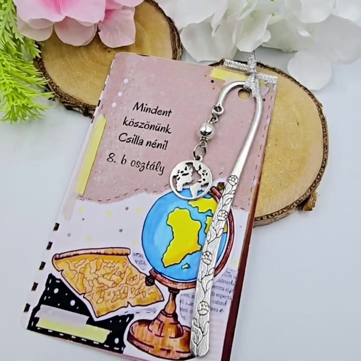 Ajándék földrajztanároknak ballagásra, pedagógusnapra, tanév végére - Könyvjelző földgömb charmmal, ajándékkártyán