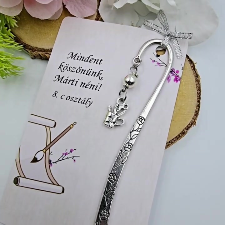 Ajándék rajztanároknak ballagásra, pedagógusnapra, tanév végére - Könyvjelző rajzkészlet charmmal, ajándékkártyán