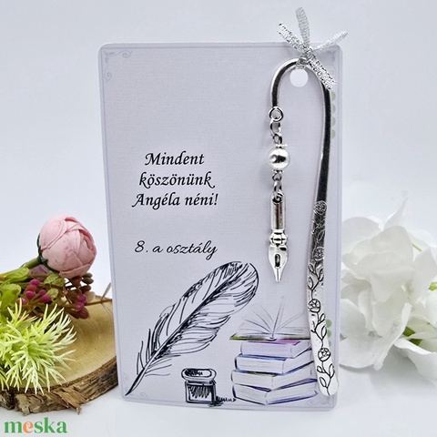 Ajándék magyartanároknak ballagásra, pedagógusnapra, tanév végére - Könyvjelző tustoll charmmal, ajándékkártyán
