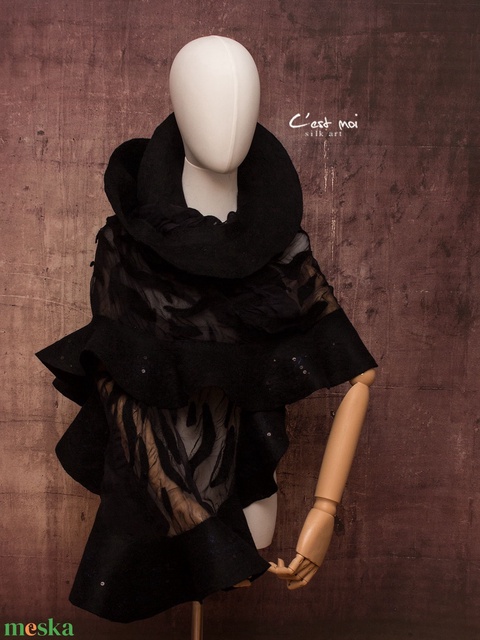 Fekete selyemre muszlinra nemezelt gyapjú stóla ,különleges alkalomra
