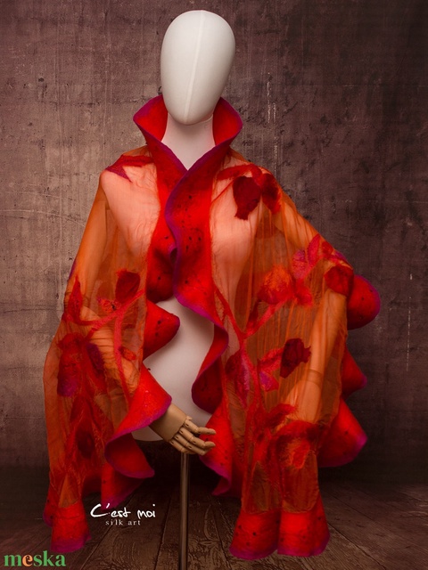 Piros selyemre muszlinra nemezelt gyapjú stóla gránátalmás mintával ,különleges alkalomra