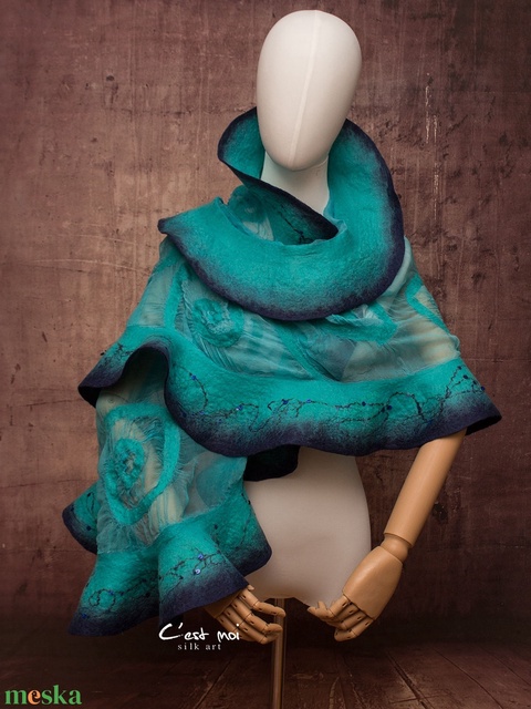 Kék selyemre muszlinra nemezelt gyapjú stóla ,különleges alkalomra