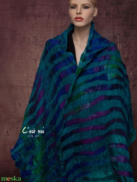 kék csíkos selyemre nemezelt gyapjú stóla esküvőre , alkalomra
