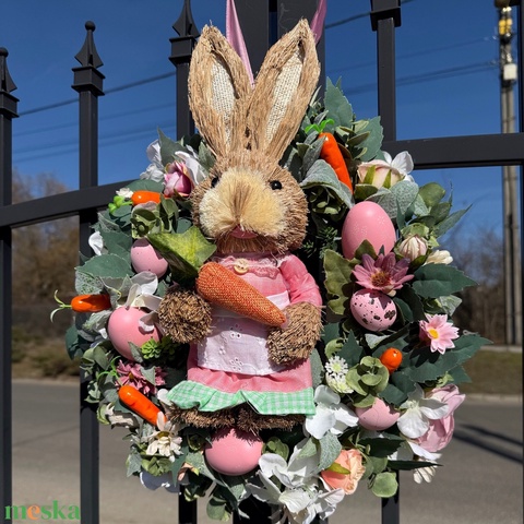 - Anyag/Összetevő szalaggal bevont szalma koszorú, szalma nyuszi, műanyag tojások, selyemvirágok és zöldek
