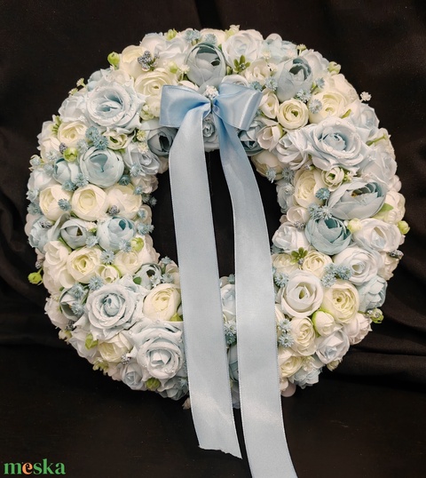 Világoskék és fehér virágokkal készült kopogtató