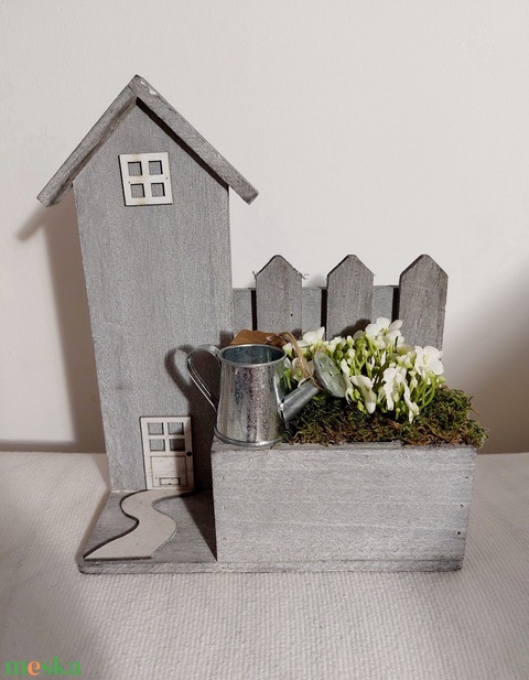 Fa házikó alapú tavaszi asztaldísz, akár ajándékba