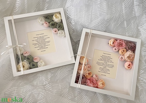Szülőköszöntő virágos képkeret kedves üzenettel - sarkos elrendezés zöld - krém virágokkal