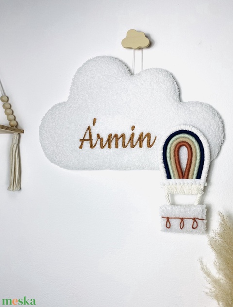 Névre szóló hímzett bárányfelhő fali dekoráció makramé hőlégballonnal - két méretben