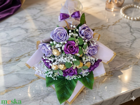 Kétféle lila szín felhasználásával, szatén szalag technikával készül virágok, dekoratív elemekkel tarkítva, édes emléket állítva egy napnak, amit sosem feled el!