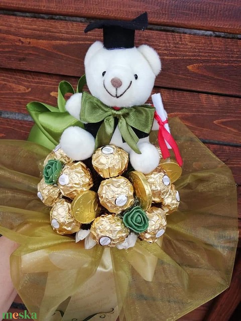 Rocher csokor diplomasapis macival,zöld színű organzával