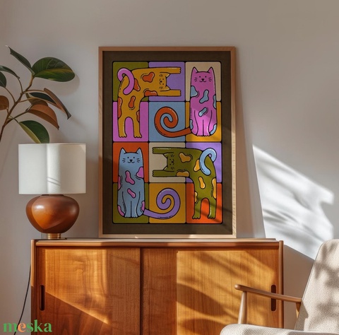 Élénk színekkel készült macskás falikép, amely játékos és barátságos hangulatot teremt. A színes kompozíció modern és kreatív megjelenést ad a térnek, miközben igazán szerethető karaktert visz az enteriőrbe.