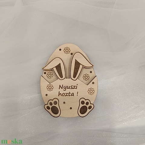 Kedves, gravírozott fa húsvéti dekor „Nyuszi hozta!” felirattal.
