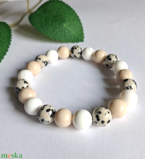 Dalmata jáspis ásvány karkötő krém színű márvánnyal és kagylóhéjgyönggyel