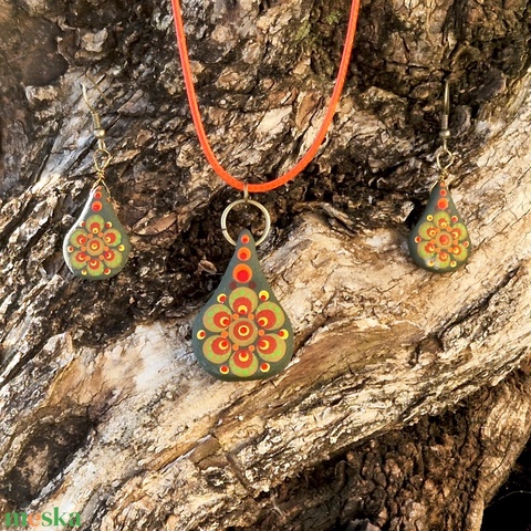 Kerámia ékszerszett pontfestéssel - nyaklánc + fülbevaló (csepp forma)