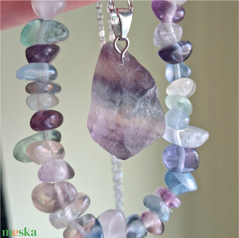 Fluorit ásvány ékszerszett- splitter karkötő, nemesacél nyaklánc nyers fluorit medállal