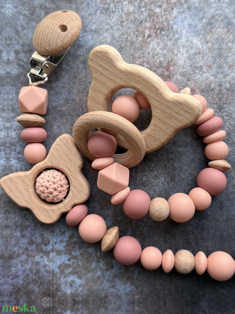 BABABOX készletről rozé és barack csörgő rágóka és cumilánc