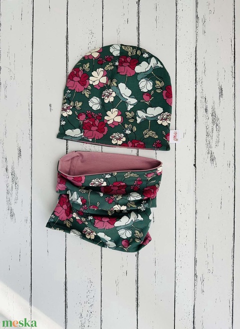 Zöld alapon virágos sapka-sál szett (50-52 cm)