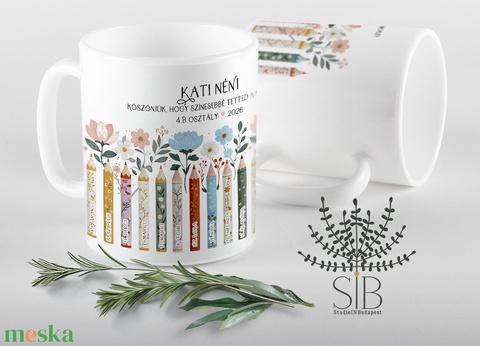 Ballagási ajándék tanároknak, színes ceruza grafikás névre szóló pedagógus, óvodai köszönő ajándék bögre