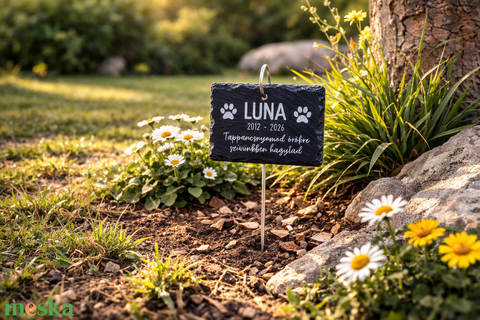 Egyedi névvel ellátott kisállat emléktábla kutyáknak, macskáknak és egyéb házi kedvenceknek, kis cölöppel leszúrható
