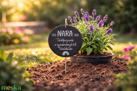 Egyedi névvel ellátott kisállat emléktábla kutyáknak, macskáknak és egyéb házi kedvenceknek, kis cölöppel leszúrható