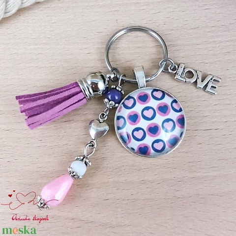 Szíves kulcstartó rózsaszín bojttal – ajándék barátnőnek, anyának