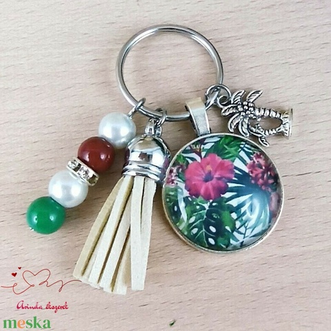Trópusi virágos kulcstartó bézs bojttal – nyári ajándék nőknek
