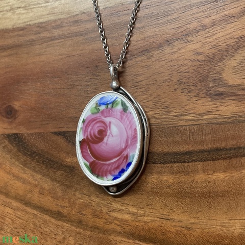 Mentett porcelán darabok - rózsa medálos nyaklánc nemesacél lánccal