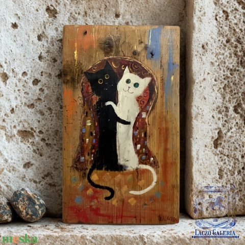 Ó, Lukrécia! - Rusztikus Fatábla, Egyedi Falikép, Akril Festmény - Klimt után szabadon, Fekete macska, Cica