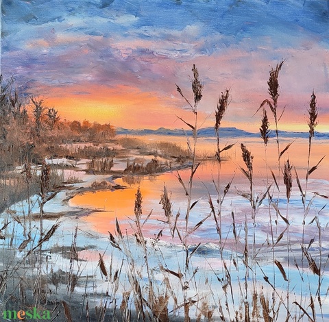 Ha békét árasztó, harmonikus balatoni festményt keresel, mely az otthonod dísze lehet, akkor ezt szeretettel ajánlom! A festményt 2026 januárjában készítettem festőkéssel, mikor a Balaton befagyott, és ez nagyon inspirált. A meleg színek felmelegítettek, a Balaton télen is gyönyörű! Próbáltam visszaadni a táj lilás, narancsos színeit naplementekor, mely a hideg téma ellenére meleg érzéssel tölt fel. A távoli hegyek és fátyolfelhők, a nyugodt, jeges vízfelület békességet és nyugalmat áraszt. A nádak mögül rálátunk a fákkal, nádassal borított havas öbölre. Rendeld meg a képet, ha tetszik, és illik az otthonodhoz. Ez a kép most a családom kedvence, az egyik legszebb festményem.