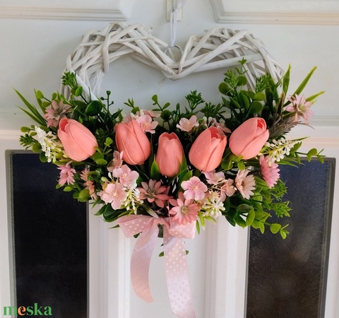 Fehér szív vessző alapú tavaszi ajtódísz tulipánokkal