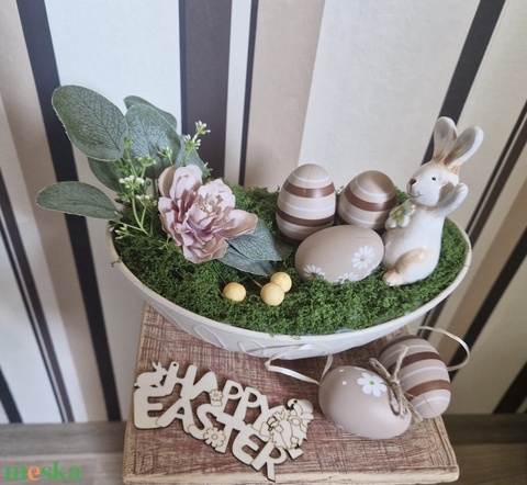 - Anyag/Összetevő dekor tál, művirág, moha, dekor tojás, kerámia nyuszi, műnövény, dekorációs alap, virágkötészeti alap, ragasztó, díszítő elem