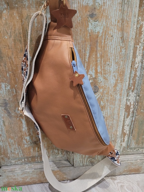 Barna-kék táska.. Övtáska fazonú táska. Testtáska, válltáska, műbőr testtáska. Praktikus, könnyű viselet ez a műbőrből készült táska, elférnek benne az apróbb dolgaid, pl: telefon pénztárca. Városi sétához, kiránduláshoz rendkívül praktikus, könnyű, kényelmes. Bélése pamutvászon, egy cipzáras zseb található benne. Mérete:magassaga: 20 cm szélessége: felül 35 cm alul: 24 cm . Állítható, vagány mintás hevederrel . Valódi bőr cipzárdísszel.
