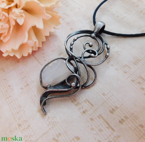 A medál Tiffany technikával készült holdkő, réz és ólommentes, ezüsttartalmú ón felhasználásával. A díszítés szintén saját készítésű, nem tartalmaz gyári elemeket. A fémrészt óezüstre patináztam és lelakkoztam, hogy sokáig szép maradjon.