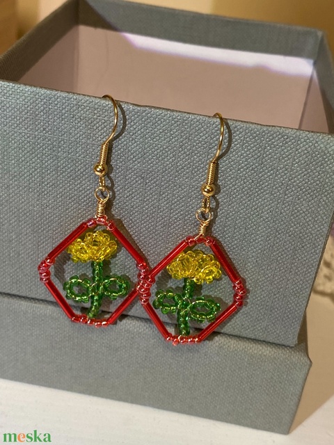 Vidám, tavaszi fülbevaló; piros keretben sárga virággal.