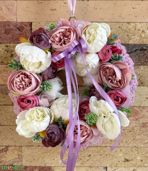 - Anyag/Összetevő koszorú alap, selyem virágok