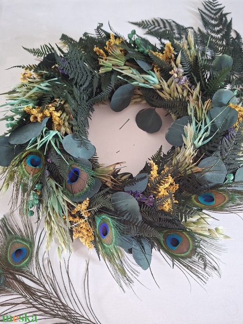 Szárítottvirágos ajtódísz, falidísz pávatollal